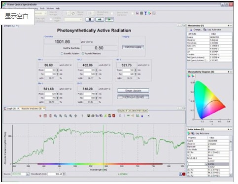 除了可計算總的PAR值,SpectraSuite-PAR允許用戶定義至多5個光譜段,每個光譜段可對應植物的某個生長期。例如定義計算400nm-480nm藍光光譜段的光合效能,與植物生長初期相對應。當然,用戶可以計算每個光譜段的光合效能比例,紅/遠紅外比例與植物生長及結構有關。
