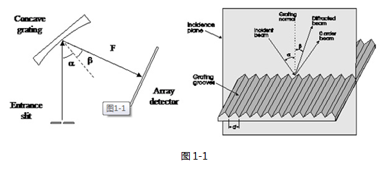 其中Βeta是衍射角,d是槽周期(這是等于槽密度的倒數),m為衍射級,λ是光的波長,如圖1-1。