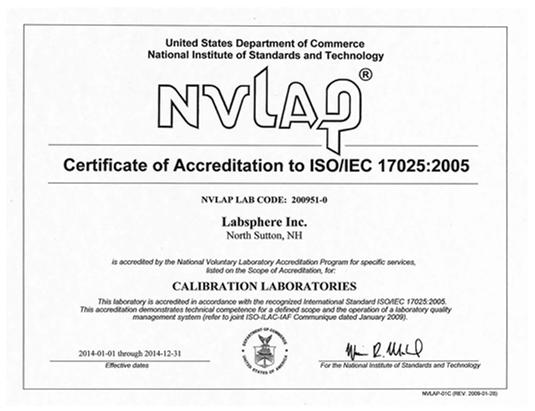 系統自帶標準燈和標準燈電源,可便于客戶現場校準,校準數據經過NVLAP認可,并可溯源至美國國家標準和技術協會(NIST),提供的校準數據是整個可見光波段絕對光譜輻射通量而不是幾個特定波長的流明值,保證了校準的準確性,目前大部分設備廠家還達不到這一點。另外,標準燈不用返回原廠校準,節省費用,節省時間,而且保證使用者的標定工作不受影響。