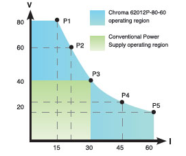 定功率范圍下提供寬廣操作 62000P系列直流電源供應(yīng)器提供寬廣的操作范圍。例如,62012P-80-60的輸出規(guī)格為 1200W/80V/60A可于不同的組合中靈活操作如圖右側(cè)所示。如普通的直流電源電源供應(yīng)器顯示提供所有的輸出電壓相同的額定電流,而62000P于低輸出電壓時(shí)提供較大的電流。這表示低電壓/高電流及高電壓/低電流兩者的待測(cè)物可使用單臺(tái)直流電源供應(yīng)器測(cè)試輸入穩(wěn)定度,于一般的ATE系統(tǒng)內(nèi)部避免多臺(tái)直流電源供應(yīng)器以節(jié)省成本與空間。